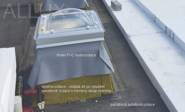 Před finální hydroizolací manžety světlíku pomocí PVC nebo asfaltové krytiny nezapomeňte provést spodní parotěsnou izolaci na manžetě světlíku